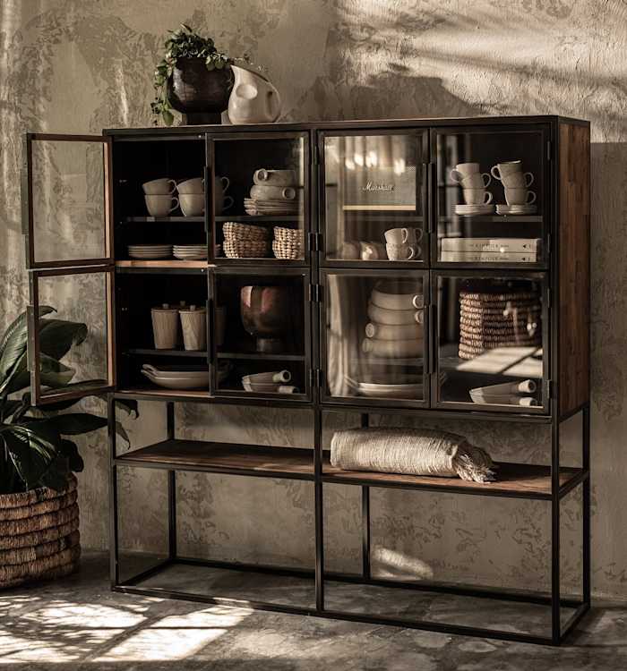 The Salvage Cabinet with eight glass doors is an exquisite modern piece of furniture designed to showcase all your treasures, while complementing your interior at the same time. The small reclaimed teak slats in various color tones show the true craftsmanship and character of the wood and are the perfect complement to the black matte finished iron frame.