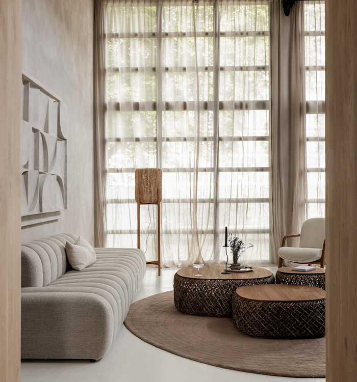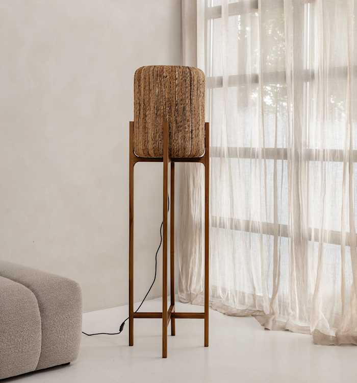 The Aurora Floor Lamp is traditionally crafted from organic abaca, handwoven into an elegant bulb shape with subtle striped detailing. Resting on a reclaimed teak frame, it combines natural warmth with timeless design. Thanks to its open weave and graceful form, Aurora brings a cozy, inviting atmosphere to any room without overpowering the space.