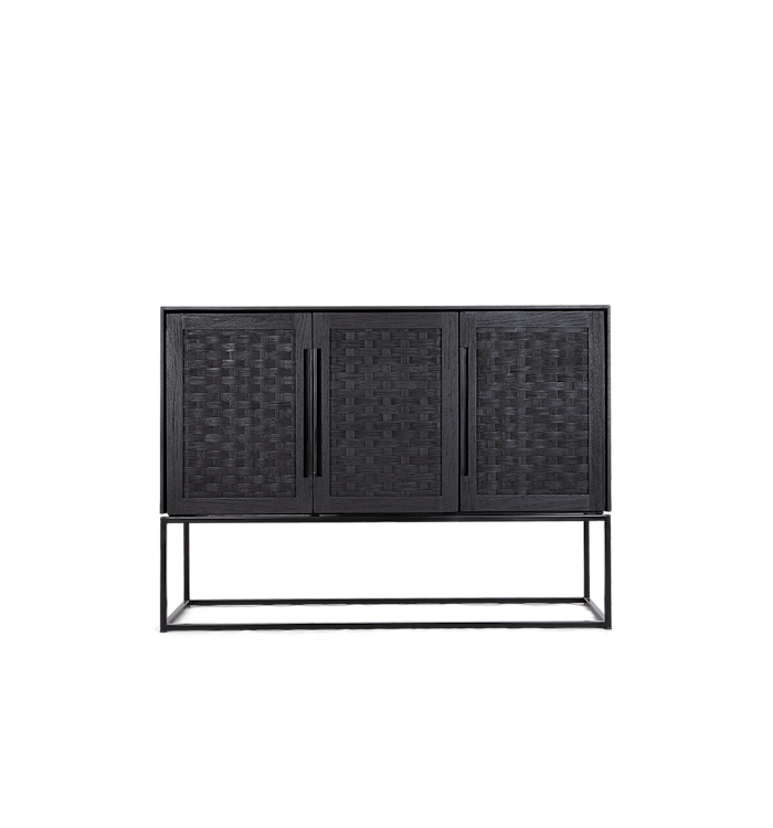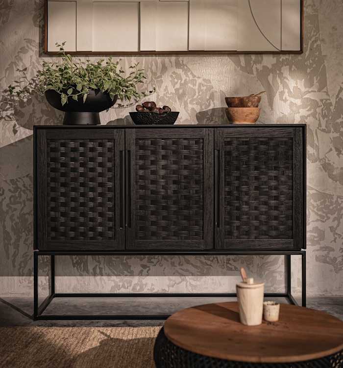 Rak lemari berwarna hitam arang (charcoal) dari koleksi Karma ini dibuat menggunakan berbagai teknik pengerjaan. Raknya dibuat dengan tangan dari kayu guna-ulang, dengan rangka besi, dan pintu dari rotan anyaman tangan, dengan warna hitam lembut (matte). Dengan pintu tertutup, Karma Dresser ini indah dan ideal untuk menyimpan barang favorit Anda