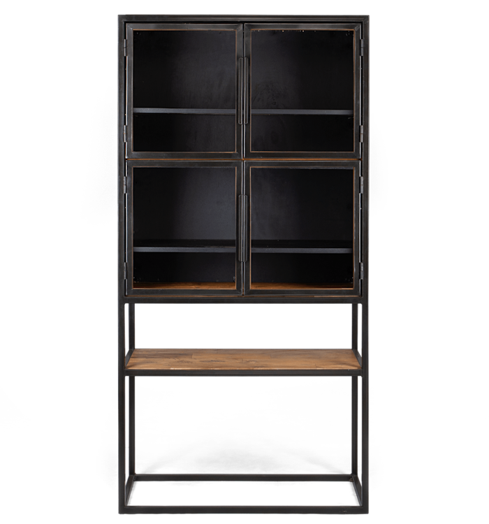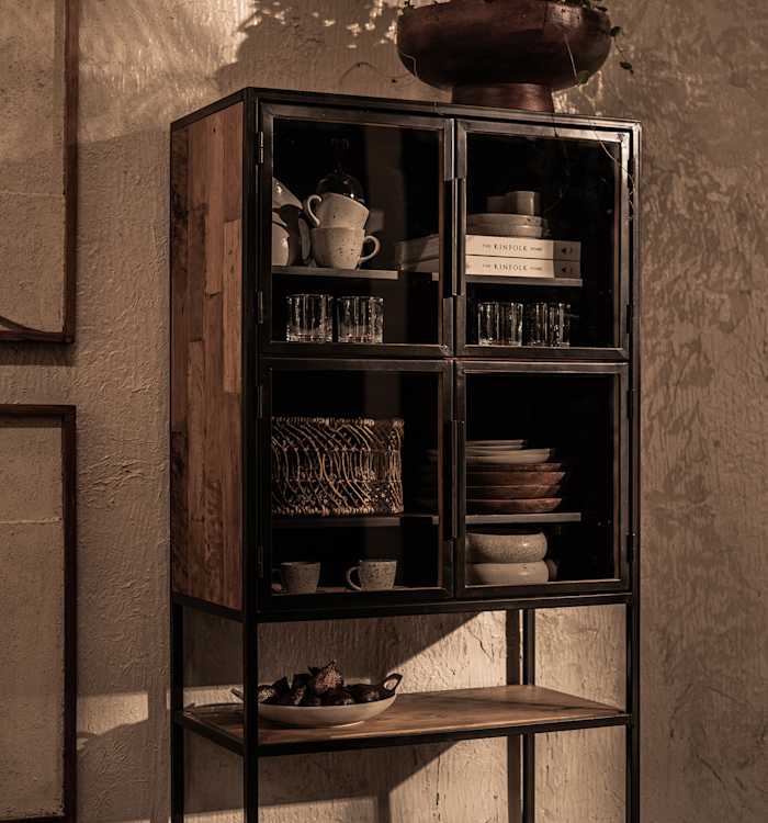 Lemari Salvage Cabinet yang tinggi memiliki empat pintu kaca, menjadikannya furnitur modern nan indah yang dirancang untuk memajang koleksi Anda, sekaligus memperindah interior. Bilah kecil kayu jati guna-ulang dalam berbagai nuansa warna menunjukkan karakter kayu dan keahlian sejati perajinnya, menjadikannya pelengkap sempurna untuk rangka besi berwarna hitam lembut (matte).